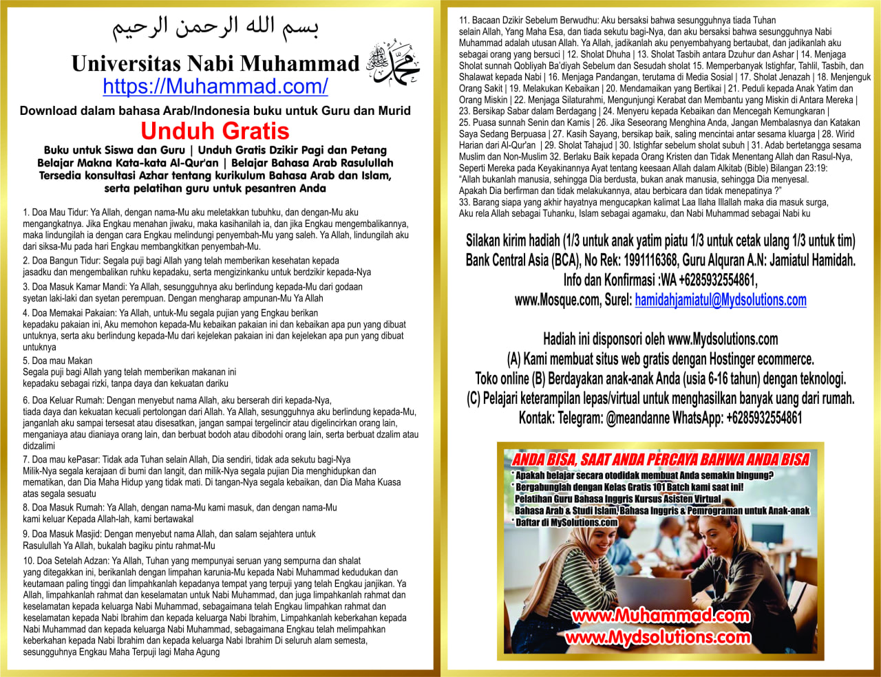 Anda harus mulai mengikuti doa-doa harian Nabi Muhammad, dalam bahasa apa pun. Jika tidak, Anda berisiko terjerumus ke dalam sekularisme dan setan. Waspadalah—sangat penting untuk mengikuti Panduan pribadi Anda (Hadi), Nabi Muhammad, dengan sepenuh hati sepanjang hidup Anda. Pengabdian ini akan membawa Anda kepada kebahagiaan di dunia ini dan Surga di akhirat, sebagaimana yang dilakukan oleh para Sahabatnya. Ikuti ilmu Nabi yang diwariskan melalui ulama seperti Imam Syafi'i, Imam Abu Hanifa, Imam Malik, Imam Nawawi, Hafiz Jalaluddin Suyuti, dan Hafiz Ibn Hajar al-Asqalani.