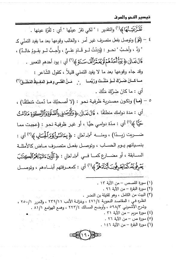 تيسير النحو والصرف تَقَرَّعَيْنُهَا ﴾ ۱ والتقدير " لكي تقرّ عينها " أي القُرّة عينها ٤ - لو وتوصل بفعل متصرف غير أمر والغالب وقوعها بعد ما يفيد التمني كـ وَدَّ وأحَبَّ " نحو وَدِدْتُ لو قام علي وأُحِبُّ لو يقوم خالد قَالَ تَعَالَى ﴿ يَوَدُّ أَحَدُهُمْ لَوْ يُعَمَّرُ أَلْفَ سَنَةٍ أي يود أحدهم التعمير وقد جاء وقوعها بعد ما لا يفيد التمني قليلاً كقول الشاعر ما كان ضَرَّكَ لَوْ مَنَنْتَ وَرُبَّما من الفتي وهو المغيظُ المُختَق ۳ أي ما كَانَ ضَرَّكَ مَنكَ ه - ما وتكون مصدرية ظرفية نحو لا أصحبك ما دمت منطلقا أي مدة دوامك منطلقا قَالَ تَعَالَى ﴿ وَأَوْصَنِي بِالصَّلَوَةِ وَالزَّكَوةِ مَا دُمْتُ ٤ أي مدّة دوامي حيًّا أو غير ظرفية نحو عجبت مما حيا أي ضربت زيدا ومنه قوله تعالى بِمَا نَسُوا يَوْمَ الْحِسَابِ أي بنسيانهم يوم الحساب وتوصل بفعل متصرف ماض كالأمثلة السابقة أو مضارع كما في قوله تعالى ﴿ الَّذِينَ ءَاتَيْنَاهُمُ الْكِتَبَ يَعْرِفُونَهُ كَمَا يَعْرِفُونَ أَبْنَاءَهُمْ ﴾ ٢ أي كمعرفتهم أبناء هم وتوصـــل ۱ سورة القصص - من الآية ١٣ سورة البقرة - من الآية ٩٦ ۳ البيت من الكامل وهو لقتيلة بن النضر انظره في المقاصد النحوية ٤١/٤ وخزانة الأدب ۳۹/۱۱ والدرر ٢٥٠/١ وشرح الأشموني ٥۹۸/۳ وأوضح المسالك ٣/٤ وهمع الهوامع ۸۱/۱ ٤ سورة مريم - من الآية ٣١ ٥ سورة ص - من الآية ٢٦ ٦ سورة البقرة - من الآية ١٤٦ ۱۹۰ |