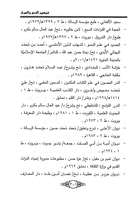 | تيسير النحو والصرف سعيد الأفغاني طبع مؤسسة الرسالة ط ۱۳۹۹هـ / ۱۹۷۹م الحجة في القراءات السبع لابن خالويه تح/ عبد العال سالم مكرم دار الشروق بيروت ۱۳۹۷هـ ۱۹۷۷م الحدود علم الشهاب الدين الأندلسي أحمد بن محمد البجائي الأبدي نجاة حسن الله الناشر الجامعة الإسلامية بالمدينة المنورة ١٤٢١هـ ٢٠٠١م ۱۹۸۹م خزانة الأدب للبغدادي تح وشرح السلام هارون مكتبة الخانجي القاهرة الدر المصون الكتاب المكنون للسمين الحلبي علي معوض وآخرين الكتب العلمية 1 ١٤١٤هـ ١٩٩٤م ونشر القلم دمشق الدرر اللوامع للشنقيطي د البحوث الكويت ۱ ۱۹۸۱م وطبعة المعرفة ۱۹۷۳م ديوان الأعشى شرح وتعليق مُحمّد مُحمد حسين ۷ ۱۹۸۳م أمية أبي الصلت جمعه بشير يموت ١ ١٩٣٤م دیوان تميم مقبل عزة مطبوعات مديرية إحياء التراث القديم وزارة الثقافة ١٩٦٢م جرير عطية نعمان أمين طه المعارف |