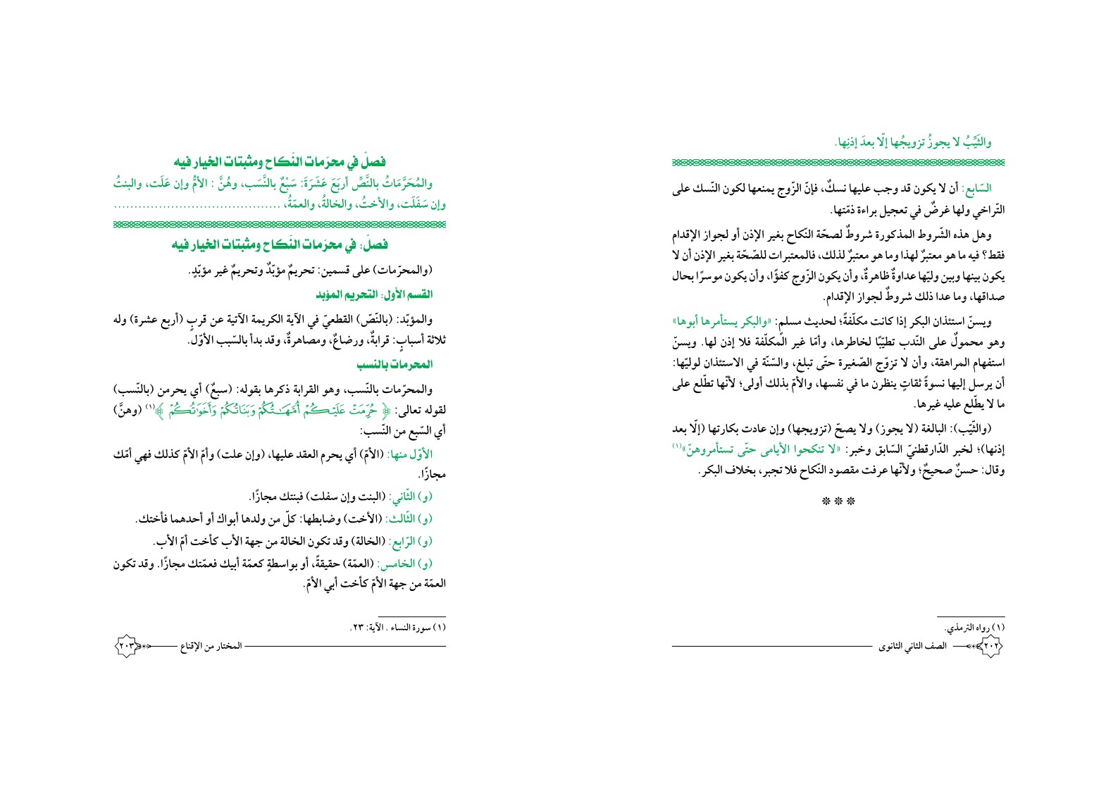 | والثيب لا يجوز تزويجها إلَّا بعدَ إِذْنِها السابع أن يكون قد وجب عليها نسكٌ فإنّ الزوج يمنعها لكون النسك على التراخي ولها غرض في تعجيل براءة ذمتها وهل هذه الشروط المذكورة شروط لصحة النكاح بغير الإذن أو لجواز الإقدام فقط فيه ما هو معتبر لهذا وما لذلك فالمعتبرات للصحة بينها وبين وليها عداوة ظاهرة وأن كفوا موسرًا بحال صداقها عدا ذلك ويسن استئذان البكر إذا كانت مكلّفةً لحديث مسلم والبكر يستأمرها أبوها وهو محمول الندب تطيّبًا لخاطرها وأما غير المكلفة فلا إذن لها ويسنّ استفهام المراهقة تزوّج الصغيرة حتّى تبلغ والسنة الاستئذان لوليها يرسل إليها نسوةً ثقاتٍ ينظرن نفسها والأم بذلك أولى لأنها تطلع يطلع عليه غيرها والتيب البالغة ولا يصح وإن عادت بكارتها إلّا بعد إذنها لخبر الدارقطني السابق وخبر الا تنكحوا الأيامى حتى تستأمروهن۱ وقال حسن صحيح ولأنها عرفت مقصود تجبر بخلاف فصل محرمات ومثبتات الخيار والمُحَرَّمَاتُ بالنَّصَّ أربَعَ عَشَرَةَ سَبْعٌ بالنَّسَب وهُنَّ الأم وإِن عَلَت والبنتُ سَفَلَت والأختُ والخالة والعمة والمحرمات قسمين تحريم مؤبد وتحريم القسم الأول التحريم المؤبد والمؤبد بالنّصّ القطعي الآية الكريمة الآتية عن قرب أربع عشرة وله ثلاثة أسباب قرابة ورضاع ومصاهرة وقد بدأ بالسبب المحرمات بالنسب القرابة ذكرها بقوله سبع أي يحرمن لقوله تعالى ﴿ حُرِّمَتْ عَلَيْكُمْ أُمَّهَتُكُمْ وَبَنَاتُكُمْ وَأَخَوَاتُكُمْ وهنَّ السبع من النسب منها يحرم العقد علت وأم كذلك فهي أمك مجازا و الثاني البنت سفلت فبنتك الثالث الأخت وضابطها كلّ ولدها أبواك أحدهما فأختك الرابع الخالة تكون جهة الأب كأخت أم الخامس العمة حقيقةً بواسطة كعمّة أبيك فعمتك أبي ۱ رواه الترمذي الصف الثانوى سورة النساء ٢٣ المختار الإقناع |