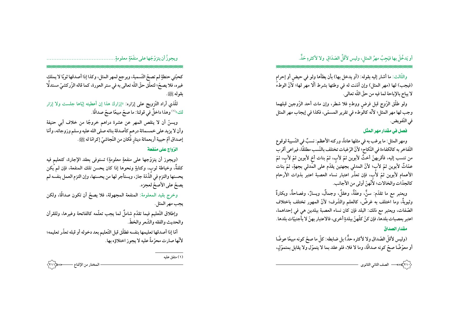 | أو يَدخُلَ بها فيَجِبُ مهرُ المثل وليس لأقَلَّ الصَّدَاقِ ولا لأكثرهِ حَةٌ والثالث ما أشار إليه بقوله يدخل بأن يطأها ولو في حيض إحرام فيجب لها مهر وإن أذنت له وطئها بشرط ألا لأنّ الوطء لا يباح بالإباحة لما فيه من حق الله تعالى طلق الزوج قبل فرض ووطء فلا شطر مات أحد الزوجين قبلهما وجب لأنه كالوطء تقرير المسمّى فكذا إيجاب التفويض فصل مقدار ومهر يرغب به مثلها عادةً وركنه الأعظم نسب النسيبة لوقوع التفاخر كالكفاءة النكاح الرغبات تختلف بالنسب مطلقا فيراعى أقرب تنسب فأقربهنّ أخت لأبوين ثمّ لأب بنات أخ عماتُ ثم المدلي بجهتين يقدّم على بجهة الأعمام فإن تعذر اعتبار نساء العصبة اعتبر بذوات الأرحام كالجدات والخالات لأنهن أولى الأجانب ويعتبر مع تقدّم سن وعفَةٌ وعقل وجمال ويسار وفصاحة وبكارة وثيوبةٌ وما اختلف غرض كالعلم والشّرف المهور باختلاف الصفات ذلك البلد كان ببلدين هي إحداهما بعصبات بلدها كنّ كلّهنّ ببلدة أخرى فالاعتبار بهنّ بأجنبيات الصداق لأقل لأكثره حد بل ضابطه كلّ صح كونه مبيعًا عوضًا معوّضًا صداقًا فلو عقد بما يتموّل يقابل بمتموّل الصف الثاني الثانوى ويجوز أن يتزوجها منفَعَةٍ معلومةٍ كحبتي حنطة لم تصح التسمية ويرجع لمهر وكذا إذا أصدقها ثوبًا يملك غيره يصح لتعلق ستر العورة كما قاله الزركشي مستدلا للذي أراد التزويج إزاره إزارك هذا إن أعطيته إياها جلست إزار لك ١ وهذا داخل قولنا ويسن ينقص المهر عن عشرة دراهم خروجًا خلاف أبي حنيفة وأن يزيد خمسمائة درهم كأصدقة بناته صلى عليه وسلم وزوجاته وأما إصداق أم حبيبة أربعمائة دينار فكان النجاشي إكراما الزواج منفعة معلومة تستوفى بعقد الإجارة كتعليم كلفة وخياطة ثوب وكتابة ونحوها يحسن تلك المنفعة يكن يحسنها والتزم الذمة جاز ويستأجر التزم العمل بنفسه الأصح لعجزه وخرج بقيد المعلومة المجهولة تكون ولكن يجب وإطلاق التعليم فيما شامل تعلمه كالفاتحة وغيرها وللقرآن والحديث والفقه والشعر والخط أما تعليمها فطلق بعد دخوله قبله تعليمه لأنها صارت محرّمةً يجوز اختلاؤه ۱ متفق المختار الإقناع |