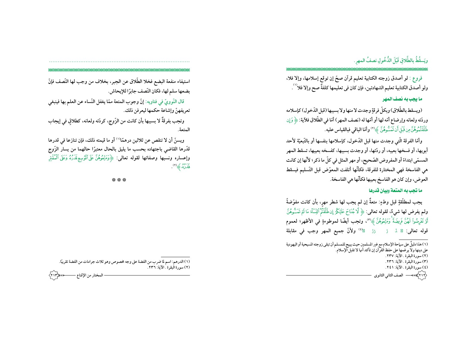 | ويَسقُطُ بالطَّلاقِ قَبْلَ الدُّخُولِ نصفُ الـ المهر فروع لو أصدق زوجته الكتابية تعليم قرآن صح إن توقع إسلامها وإلا فلا ولو الشهادتين فإن كان في تعليمها كلفة ما يجب به نصف ويسقط بالطلاق وبكلّ فرقةٍ وجدت لا منها ولا بسببها قبل الدخول كإسلامه وردته ولعانه وإرضاع أمه لها أو أمها له أما الطلاق فلآية طَلَّقْتُمُوهُنَّ مِن قَبْلِ أَن تَمَسُّوهُنَّ ٢ وأما الباقي فبالقياس عليه الفرقة التي كإسلامها بنفسها بالتبعية لأحد أبويها فسخها بعيبه ردّتها كفسخه بعيبها تسقط المسمّى ابتداءً المفروض الصحيح مهر المثل كل ذكر لأنها كانت هي الفاسخة فهي ا المختارة للفرقة فكأنها أتلفت المعوّض التسليم فيسقط العوض وإن هو الفاسخ هم تجب المتعة وبيان قدرها لمطلقة وطء متعة لم شطر بأن مفوضةً ولم يفرض شيء لقوله تعالى ﴿ لَا جُنَاحَ عَلَيْكُمْ إِن طَلَّقْتُمُ النِّسَاءَ مَا لَمْ أَوْ تَفْرِضُوا لَهُنَّ فَرِيضَةً ومَتَّعُوهُنَّ ۳ وتجب أيضًا لموطوءة الأظهر لعموم قوله 18 ر ولأن جميع وجب مقابلة ۱ هذا دليل على سماحة الإسلام مع غير المسلمين حيث يبيح للمسلم أن تبقى المسيحية اليهودية دينها يرغمها حفظ القرآن تأكد أنها تقبل سورة البقرة الآية ۳۷ ٢٣٦ ٤ ٢٤١ الصف الثاني الثانوى استيفاء منفعة البضع فخلا عن الجبر بخلاف من النصف فإنّ بضعها سلم فكان جابرا للإيحاش قال النووي فتاويه إنّ وجوب ممّا يغفل النساء العلم بها فينبغي تعريفهن وإشاعة حكمها ليعرفن ذلك بفرقة الزوج كردّته كطلاق إيجاب ويسن تنقص ثلاثين درهما قيمته تنازعا القاضي باجتهاده بحسب يليق بالحال معتبرًا حالهما يسار وإعساره ونسبها وصفاتها ﴿وَمَتِّعُوهُنَّ عَلَى الْمُوسِعِ قَدَرُهُ وَعَلَى الْمُقْتِرِ قدره 1 الدرهم اسم لما ضرب الفضة وجه مخصوص وهو ثلاث جرامات تقريباً المختار الإقناع |