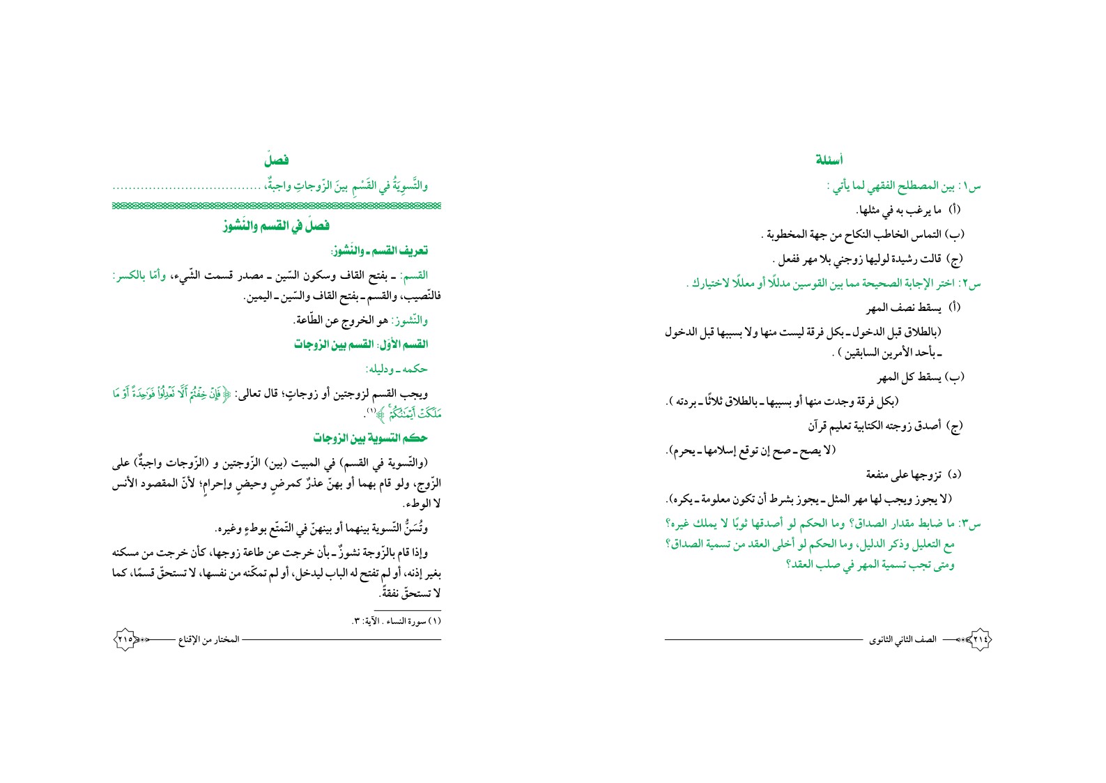 أسئلة س ١ بين المصطلح الفقهي لما يأتي أ ما يرغب به في مثلها ب التماس الخاطب النكاح من جهة المخطوبة ج قالت رشيدة لوليها زوجني بلا مهر ففعل س ٢ اختر الإجابة الصحيحة مما بين القوسين مدللاً أو معللًا لاختيارك أ يسقط نصف المهر بالطلاق قبل الدخول - بكل فرقة ليست منها ولا بسببها قبل الدخول بأحد الأمرين السابقين ب يسقط كل المهر بكل فرقة وجدت منها أو بسببها - بالطلاق ثلاثًا - بردته ج أصدق زوجته الكتابية تعليم قرآن د تزوجها على منفعة لا يصح - صح إن توقع إسلامها ـ يحرم لا يجوز ويجب لها مهر المثل - يجوز بشرط أن تكون معلومة ـ يكره س ۳ ما ضابط مقدار الصداق وما الحكم لو أصدقها ثوبًا لا يملك غيره مع التعليل وذكر الدليل وما الحكم لو أخلى العقد من تسمية الصداق ومتى تجب تسمية المهر في صلب العقد فصل والتَّسْوِيَةُ في القَسْمِ بينَ الزوجاتِ واجبةٌ تعريف القسم - والنشوز فصل في القسم والنشوز القسم - بفتح القاف وسكون السين - مصدر قسمت الشيء وأما بالكسر فالنصيب والقسم - بفتح القاف والسين - اليمين الطاعة والنشوز هو الخروج عن ا القسم الأول القسم بين الزوجات حكمه - ودليله ويجب القسم لزوجتين أو زوجات قال تعالى ﴿ فَإِنْ خِفْتُمْ أَلَّا نَعْدِلُوا فَوَاحِدَةً أَوْ مَا مَلَكَتْ أَيْمَتُكُمْ حكم التسوية بين الزوجات والتسوية في القسم في المبيت بين الزوجتين و الزوجات واجبة على الزوج ولو قام بهما أو بهنّ عذر كمرض وحيض وإحرام لأن المقصود الأنس لا الوطء وتُسَنُّ التسوية بينهما أو بينهنّ في التمتع بوطء وغيره وإذا قام بالزوجة نشوز - بأن خرجت عن طاعة زوجها كأن خرجت من مسكنه بغير إذنه أو لم تفتح له الباب ليدخل أو لم تمكنه من نفسها لا تستحق قسما كما لا تستحق نفقة ۱ سورة النساء الآية ٣ الصف الثاني الثانوى المختار من الإقناع |