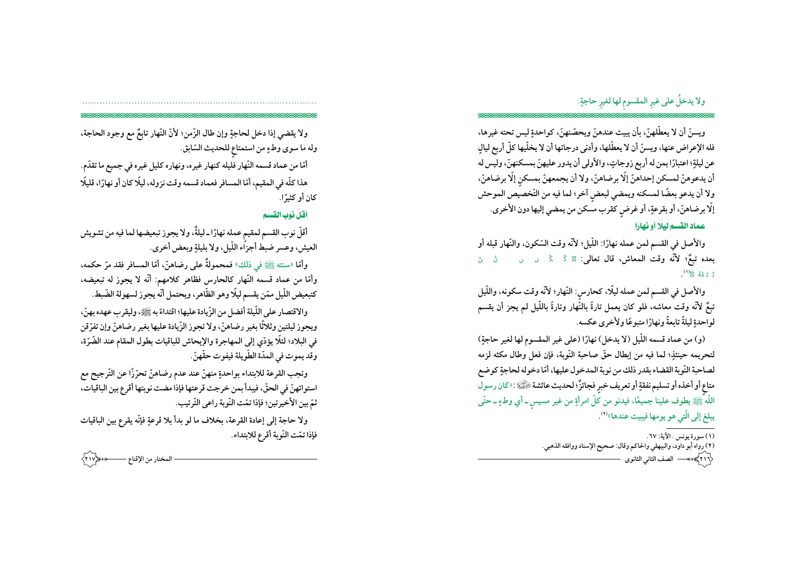 | ولا يدخل على غير المقسوم لها لغير حاجة ويسن أن لا يعطلهنّ بأن يبيت عندهنّ ويحصنهنّ كواحدة ليس تحته غيرها فله الإعراض عنها يعطلها وأدنى درجاتها يخليها كل أربع ليالٍ عن ليلة اعتبارًا بمن له زوجات والأولى يدور عليهن بمسكنهنّ وليس يدعوهن لمسكن إحداهنّ إلا برضاهنّ يجمعهن بمسكن يدعو بعضًا لمسكنه ويمضي لبعض آخر لما فيه من التخصيص الموحش برضاهن أو بقرعة غرض كقرب مسكن يمضي إليها دون الأخرى عماد القسم ليلا نهارا والأصل في لمن عمله نهارًا الليل لأنه وقت السكون والنهار قبله بعده تبع المعاش قال تعالى 3 ثيقة ٹ كحارس النهار سكونه والليل معاشه فلو كان يعمل تارةً بالنّهار وتارةً بالليل لم يجز يقسم لواحدة ليلةً تابعةً ونهارًا متبوعا ولأخرى عكسه و قسمه لتحريمه حينئذ إبطال حق صاحبة النوبة فإن فعل وطال مكثه لزمه لصاحبة القضاء بقدر ذلك نوبة المدخول عليها أما دخوله لحاجة كوضع متاع أخذه تسليم نفقة تعريف خبر فجائز لحديث عائشة رسول الله يطوف علينا جميعًا فيدنو كلّ امرأة مسيس ـ أي وطء حتى يبلغ إلى التي هو يومها فيبيت عندها ٢ ۱ سورة يونس الآية ٦٧ رواه أبو داود والبيهقي والحاكم وقال صحيح الإسناد ووافقه الذهبي الصف الثاني الثانوى يقضي إذا دخل وإن طال الزمن لأنّ النّهار تابع مع وجود الحاجة وله ما سوى استمتاع للحديث السابق فليله كنهار غيره ونهاره كليل جميع تقدّم هذا كله المقيم المسافر فعماد نزوله ليلًا قليلًا كثيرًا أقل نوب لمقيم - ليلةٌ يجوز تبعيضها تشويش العيش وعسر ضبط أجزاء بليلة وبعض أخرى وأما سنته فمحمولة رضاهن فقد مر حكمه كالحارس فظاهر كلامهم أنه تبعيضه كتبعيض ممّن وهو الظاهر ويحتمل لسهولة الضبط والاقتصار الليلة أفضل الزيادة اقتداء به وليقرب عهده بهن ويجوز ليلتين وثلاثا بغير رضاهنّ تجوز تفرقن البلاد لئلا يؤدّي المهاجرة والإيحاش للباقيات بطول المقام عند الضرة وقد يموت المدة الطويلة فيفوت حقهن وتجب القرعة للابتداء بواحدة منهنّ عدم تحرّزًا الترجيح استوائهن الحق فيبدأ خرجت قرعتها فإذا مضت نوبتها أقرع بين الباقيات ثم الأخيرتين تمت راعي الترتيب إعادة بخلاف لو بدأ بلا قرعة فإنه يقرع المختار الإقناع |