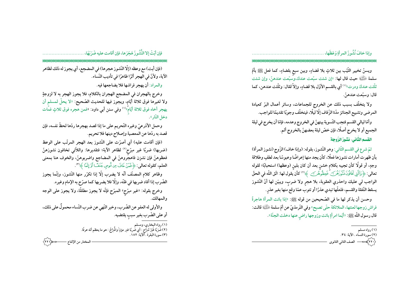 | وإذا خافَ نُشُوزَ المرأةِ وَعَظَهَا ويسن تخيير الثيب بين ثلاث بلا قضاء وبين سبع بقضاء كما فعل صلى الله عليه وسلم بأم سلمة حيث قال لها إن شئت سبعت عندك وسبعت عندهنّ وإن ثلثت ودرت ۱ أي بالقسم الأول وإلا لقال وثلثت عندهن ولا يتخلف بسبب ذلك عن الخروج للجماعات وسائر أعمال البر كعيادة المرضى وتشييع الجنائز مدة الزّفاف إلا ليلًا فيتخلّف وجوبًا تقديمًا للواجب وأما ليالي القسم فتجب التسوية بينهنّ في وعدمه فإما أن يخرج ليلة الجميع أو لا أصلا فإن خصّ بعضهن بالخروج أثم الثاني نشوز الزوجة ثم شرع وهو النشوز بقوله خاف الزوج المرأة بأن ظهرت أمارات نشوزها فعلا كأن يجد منها إعراضًا وعبوسًا بعد لطف وطلاقة وجه قولا تجيبه بكلام خشن كان بلين وعظها استحبابا لقوله تعالى وَالَّتِي تَخَافُونَ نُشُوزَهُنَّ فَعِظُوهُنَ ٢ يقول اتق الحق الواجب لي عليك واحذري العقوبة هجرٍ ضرب ويبين يسقط النفقة والقسم فلعلها تبدي عذرًا تتوب عمّا وقع بغير عذر وحسن يذكر ما الصحيحين من قوله إذا باتت هاجرة فراش زوجها لعنتها الملائكة حتى تصبح وفي الترمذي أم قالت رسول أيما امرأة وزوجها راض عنها دخلت الجنة رواه مسلم سورة النساء الآية ٣٤ فإِن أَبَتْ إِلا النُّشُوزَ هَجَرَها أقامت ضَرَبَهَا أبت مع وعظه إلّا هجرها المضجع يجوز له لظاهر ولأن الهجر أثرًا ظاهرًا تأديب والمراد يهجر فراشها فلا يضاجعها فيه و خرج بالهجران الهجران بالكلام به لزوجة لغيرها فوق ثلاثة أيام ويجوز فيها للحديث الصحيح يحل لمسلم أخاه سنن أبي داود فمن هجره فمات دخل النار وحمل الأذرعي وغيره التحريم على قصد بهجرها ردّها لحظ نفسه المعصية وإصلاح دينها تحريم أصرّت المرتب الوعظ ضربها ضربا غير مبرح فتقديرها واللاتي تخافون نشوزهن فعظوهن نشزن فاهجروهن المضاجع واضربوهن والخوف هنا بمعنى العلم كقوله فَمَنْ خَافَ مِن مُوصٍ جَنَفًا أَوْ إِثْمًا ۳ وظاهر كلام المصنف أنه يضرب تكرر وإنما الضرب أفاد ظنّه يضربها صرح الإمام وخرج المبرح فإنّه مطلقا الوجه والمهالك والأولى العفو وخبر النهي محمول سبب يقتضيه البخاري ومسلم ضُرَبًا غَير مُبرح ضربًا مؤذا والمبرح هو يعظم ألمه عرفًا البقرة ۱۸ الصف الثانوى المختار الإقناع |