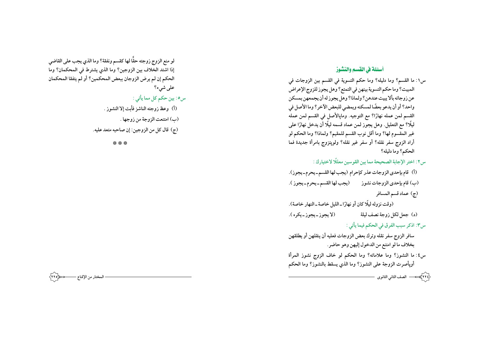 أسئلة في القسم والنشوز س1 ما القسم وما دليله وما حكم التسوية في القسم بين الزوجات في المبيت وما حكم التسوية بينهن في التمتع وهل يجوز للزوج الإعراض عن زوجاته بألا يبيت عندهن ولماذا وهل يجوز له أن يجمعهن بمسكن واحد أو أن يدعو بعضًا لمسكنه ويمضي للبعض الآخر وما الأصل في القسم لمن عمله نهارًا مع التوجيه وما پالأصل في القسم لمن عمله ليلا مع التعليل وهل يجوز لمن عماد قسمه ليلًا أن يدخل نهارًا على غير المقسوم لها وما أقل نوب القسم للمقيم ولماذا وما الحكم لو أراد الزوج سفر نقله أو سفر غير نقله ولويتزوج بامرأة جديدة فما الحكم وما دليله س ٢ اختر الإجابة الصحيحة مما بين القوسين معللا لاختيارك أ قام بإحدى الزوجات عذر كإحرام يجب لها القسم - يحرم - يجوز ب قام بإحدى الزوجات نشوز يجب لها القسم ـ يحرم ـ يجوز ج عماد قسم المسافر وقت نزوله ليلًا كان أو نهارًا - الليل خاصة ـ النهار خاصة د جعل لكل زوجة نصف ليلة س ۳ اذكر سبب الفرق في الحكم فيما يأتي لا يجوز - يجوز - يكره سافر الزوج سفر نقله وترك بعض الزوجات فعليه أن ينقلهن أو يطلقهن بخلاف ما لو امتنع من الدخول إليهن وهو حاضر س ما النشوز وما علاماته وما الحكم لو خاف الزوج نشوز المرأة أو بأصرت الزوجة على النشوز وما الذي يسقط بالنشوز وما الحكم الصف الثاني الثانوى لو منع الزوج زوجته حقًا لها كقسم ونفقة وما الذي يجب على القاضي إذا اشتد الخلاف بين الزوجين وما الذي يشترط في المحكمان وما الحكم إن لم يرض الزوجان ببعض المحكمين أو لم يتفقا المحكمان على شيء سه بين حكم كل مما يأتي أ وعظ زوجته الناشز فأبت إلا النشوز ب امتنعت الزوجة من زوجها ج قال كل من الزوجين إن صاحبه متعد عليه المختار من الإقناع |