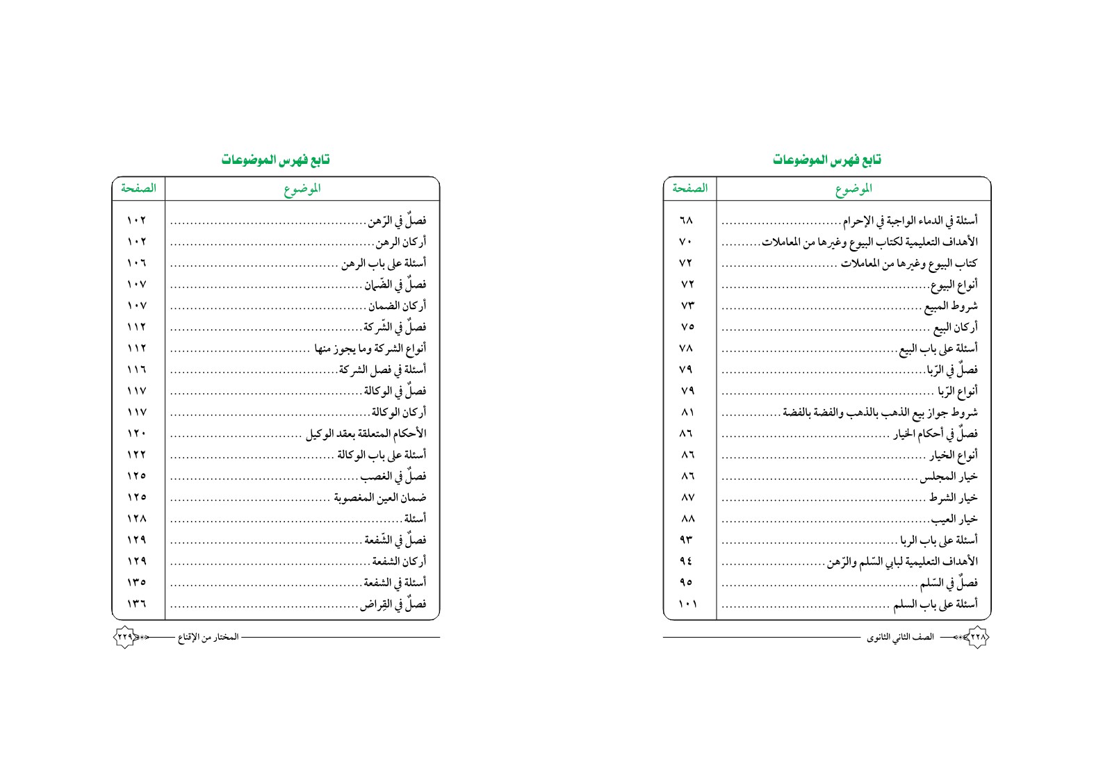 تابع فهرس الموضوعات الموضوع أسئلة في الدماء الواجبة في الإحرام الأهداف التعليمية لكتاب البيوع وغيرها من المعاملات كتاب البيوع وغيرها من المعاملات أنواع البيوع شروط المبيع أركان البيع أسئلة على باب ا فصل في الربا أنواع الربا شروط جواز بيع الذهب بالذهب والفضة بالفضة فصل في أحكام الخيار أنواع الخيار خيار المجلس خيار الشرط خيار العيب أسئلة على باب الربا الأهداف التعليمية لبابي السّلم والرّهن فصل في السلم أسئلة على باب السلم الصف الثاني الثانوى الصفحة ۶۸ V VY ۷ Vo VA ۸۱ ٨٦ ٨٦ ٨٦ ۸۷ ۸۸ ۹۵ ۱۰۱ تابع فهرس الموضوعات الصفحة الموضوع فصل في الرهن أركان الرهن أسئلة على باب الرهن فصل في الضمان أركان الضمان فصل في الشركة أنواع الشركة وما يجوز منها أسئلة في فصل الشركة فصل في الوكالة أركان الوكالة الأحكام المتعلقة بعقد الوكيل أسئلة على باب الوكالة فصل في الغصب ضمان العين المغصوبة أسئلة فصل في الشفعة أركان الشفعة أسئلة في الشفعة فصل في القراض المختار من الإقناع ۱۰ ۱۰ ۱۰۷ ۱۰۷ ۱۱ ۱۱ ١١٦ ۱۰ ١٢٥ ١٢٥ ۱۸ ۱۹ ۱۹ ۱۳۵ ١٣٦ |
