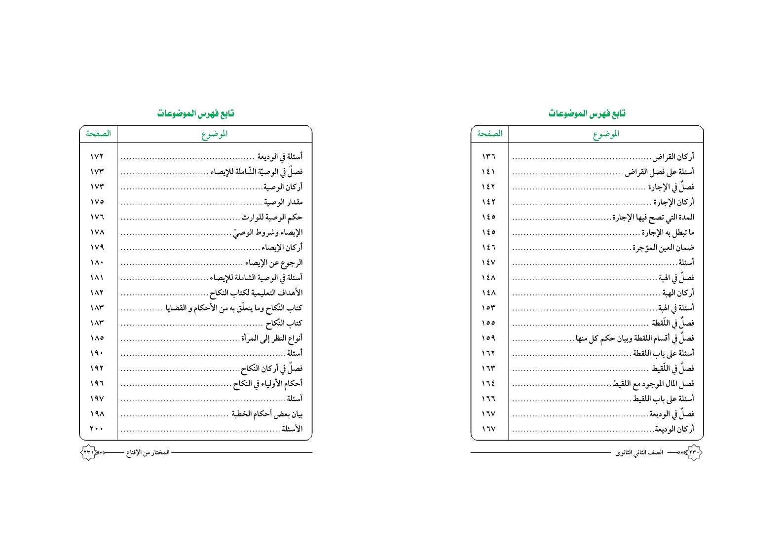 | تابع فهرس الموضوعات الصفحة ۱۷ ۱۷۳ ۱۷۵ ١٧٦ ۱۷۸ ۱۷۹ ۱۸۰ ۱۸۱ ۱۸ ۱۸۳ ۱۸۵ ۱۹۰ ۱۹ ١٩٦ ۱۹۷ ۱۹۸ ۰۰ الموضوع أسئلة في الوديعة فصل الوصية الشاملة للإيصاء أركان مقدار حكم للوارث الإيصاء وشروط الوصي الرجوع عن الأهداف التعليمية لكتاب النكاح كتاب وما يتعلق به من الأحكام والقضايا أنواع النظر إلى المرأة أحكام الأولياء بيان بعض الخطبة الأسئلة المختار الإقناع ١٣٦ 141 ١٤٢ ١٤٥ ١٤٦ ١٤٧ ١٤٨ ١٥٣ ۱۵۵ ١٥٩ ١٦٢ ١٦٣ ١٦٤ 1 ١٦٧ القراض على الإجارة المدة التي تصح فيها ما تبطل ضمان العين المؤجرة الهبة اللقطة أقسام وبيان كل منها باب اللقيط المال الموجود مع الصف الثاني الثانوى |