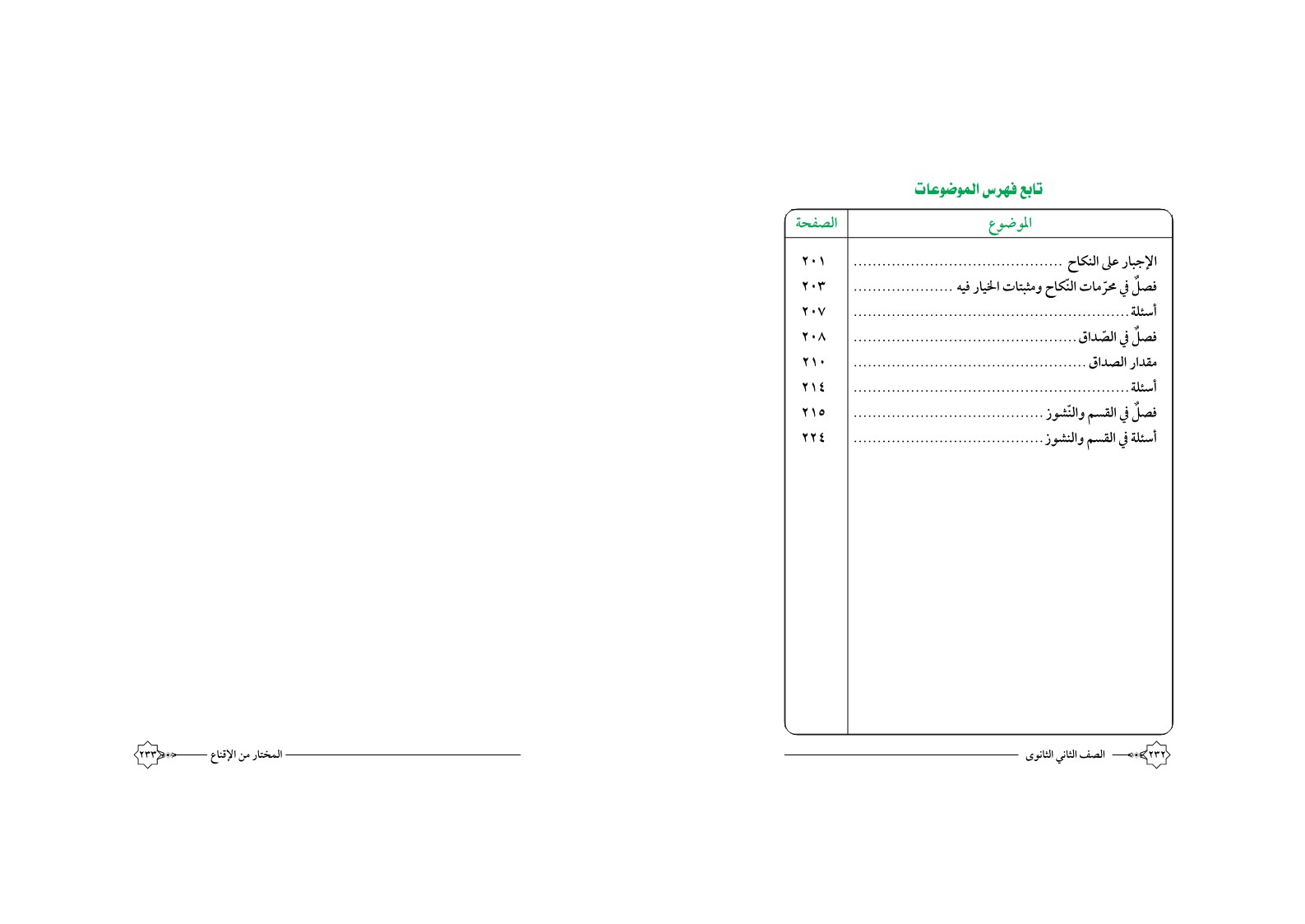 الإجبار على النكاح تابع فهرس الموضوعات الموضوع فصل في محرمات النكاح ومثبتات الخيار فيه أسئلة فصل في الصداق مقدار الصداق أسئلة فصل في القسم والنشوز أسئلة في القسم والنشوز الصف الثاني الثانوي الصفحة ۰۱ ۰۳ ۰۷ ۰۸ ۱۰ ٢١٥ ٢٢٤ المختار من الإقناع |