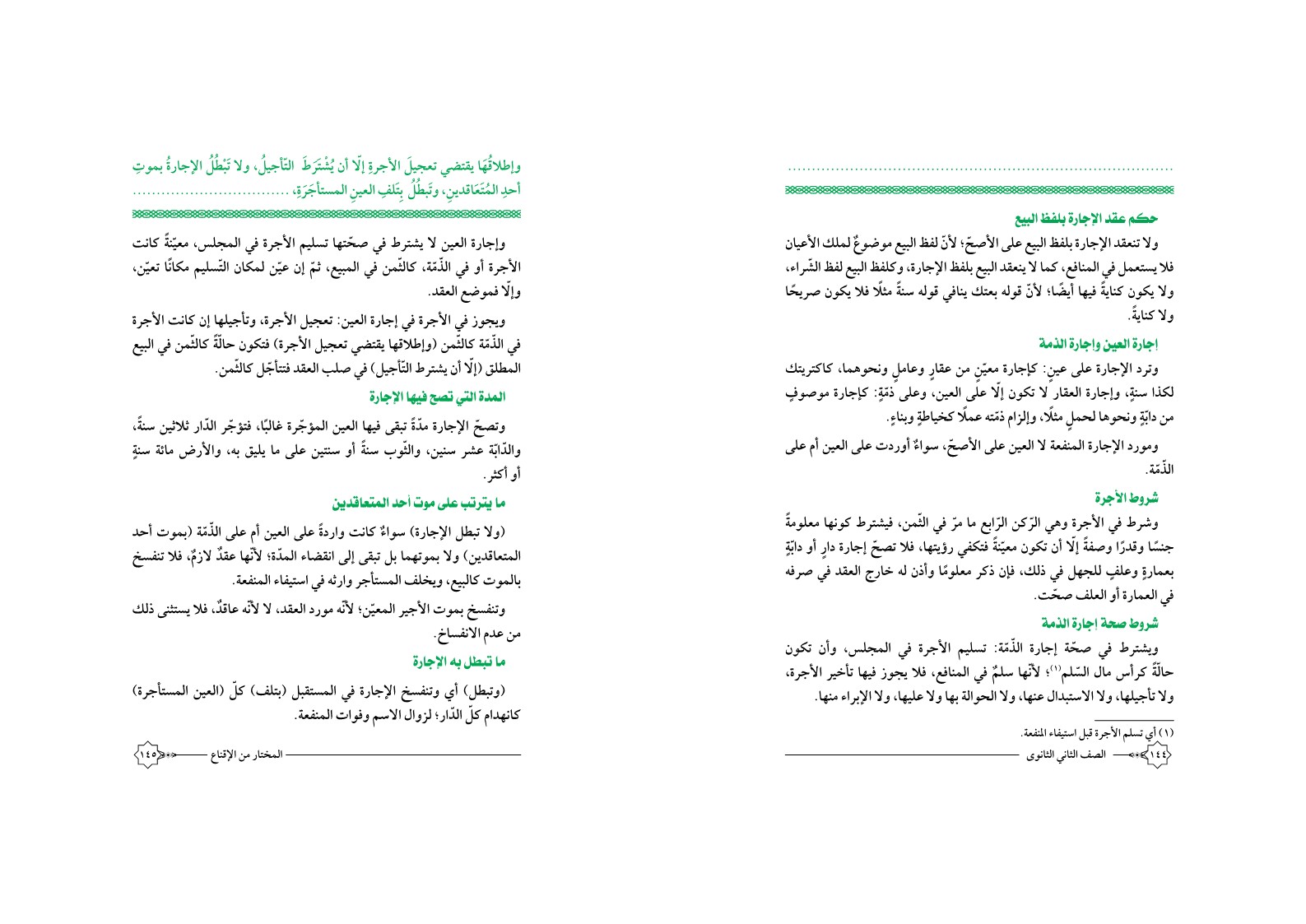 | حكم عقد الإجارة بلفظ البيع ولا تنعقد على الأصح لأنّ لفظ موضوع لملك الأعيان فلا يستعمل في المنافع كما لا ينعقد وكلفظ الشراء يكون كنايةً فيها أيضًا لأن قوله بعتك ينافي سنةً مثلًا صريحًا كناية إجارة العين وإجارة الذمة وترد عين كإجارة معيّن من عقار وعامل ونحوهما كاكتريتك لكذا سنةٍ العقار تكون إلا وعلى ذمة موصوف دابة ونحوها لحمل مثلا وإلزام ذمته عملا كخياطة وبناء ومورد المنفعة سواء أوردت أم شروط الأجرة وشرط وهي الركن الرابع ما مرّ الثّمن فيشترط كونها معلومةً جنسًا وقدرًا وصفةً أن معيّنةً فتكفي رؤيتها تصح دار أو بعمارة وعلفٍ للجهل ذلك فإن ذكر معلومًا وأذن له خارج العقد صرفه العمارة العلف صحت صحة ويشترط تسليم المجلس وأن حالة كرأس مال السلم لأنها سلم يجوز تأخير تأجيلها الاستبدال عنها الحوالة بها عليها الإبراء منها ۱ أي تسلم قبل استيفاء الصف الثاني الثانوى وإطلاقها يقتضي تعجيل يُشْتَرَطَ التأجيل تَبْطُلُ بموتِ أحدِ المُتعاقدينِ وتَبطُلُ بِتَلفِ المستأجَرَةِ يشترط صحتها معينة كانت كالثّمن المبيع ثمّ إن عيّن لمكان التسليم مكانًا تعين وإلا فموضع ويجوز وتأجيلها فتكون المطلق إلّا صلب فتتأجل المدة التي وتصح مدةً تبقى المؤجرة غالبا فتؤجر الدار ثلاثين والدابة عشر سنين والثّوب سنة سنتين يليق به والأرض مائة أكثر يترتب موت أحد المتعاقدين تبطل واردةً بموت بموتهما بل إلى انقضاء لازم تنفسخ بالموت كالبيع ويخلف المستأجر وارثه وتنفسخ الأجير المعين لأنه مورد عاقد يستثنى عدم الانفساخ وتبطل المستقبل بتلف كلّ المستأجرة كانهدام كل لزوال الاسم وفوات المختار الإقناع |
