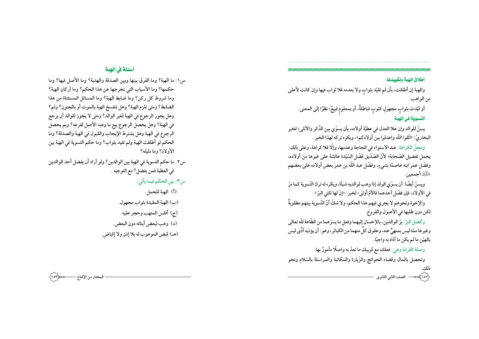 | إطلاق الهبة وتقييدها والهبة إن أطلقت بأن لم تقيّد بثواب ولا بعدمه فلا ثواب فيها وإن كانت لأعلى من الواهب أو قيدت مجهول كثوب فباطلة بمعلوم فبيع نظرًا إلى المعنى التسوية في يسن للوالد علا العدل عطية أولاده يسوي بين الذكر والأنثى لخبر البخاري اتقوا الله واعدلوا أولادكم ويكره تركه لهذا الخبر ومحل الكراهة عند الاستواء الحاجة وعدمها وإلا كراهة وعلى ذلك يحمل تفضيل الصّحابة لأنّ الصّديق فضّل السّيّدة عائشة على غيرها وفضل عمر ابنه عاصما بشيءٍ عبدا بن بعض بعضهم أجمعين ويسن أيضًا أن يسوّي الولد إذا وهب لوالديه شيئًا له ترك كما مر الأولاد فإن فضل أحدهما فالأم أولى إنّ لها ثلثي البر والإخوة ونحوهم لا يجري فيهم هذا الحكم شك بينهم مطلوبةٌ لكن دون طلبها الأصول والفروع وأفضل بر الوالدين بالإحسان إليهما وفعل ما يسرهما الطاعة لله تعالى وغيرها مما ليس بمنهي عنه وعقوق كل منهما الكبائر وهو يؤذيه أذًى بالهين يكن آذاه به واجبًا وصلة القرابة وهي فعلك مع قريبك تعد واصلا مأمور بها وتحصل بالمال وقضاء الحوائج والزيارة والمكاتبة والمراسلة بالسّلام ونحو أسئلة سا وما الفرق بينها وبين الصدقة والهدية الأصل حكمها الأسباب التي تخرجها عن أركان شروط ركن ضابط المسائل المستثناة الضابط ومتى تلزم وهل تنفسخ بالموت بالجنون ولم يجوز الرجوع لغير الوالد يرجع يحصل بيع وهبه لفرعه وبم يشترط الإيجاب والقبول والصدقة لو تفيد حكم دليله س ٢ ولو أراد يفضل أحد العطية فمن التوجيه ۳ فيما يأتي أ للحمل ب المقيدة ج أفلس المتهب وحجر عليه د لبعض أبنائه البعض هـ قبض الموهوب بلا إذن إقباض الصف الثاني الثانوي المختار الإقناع |