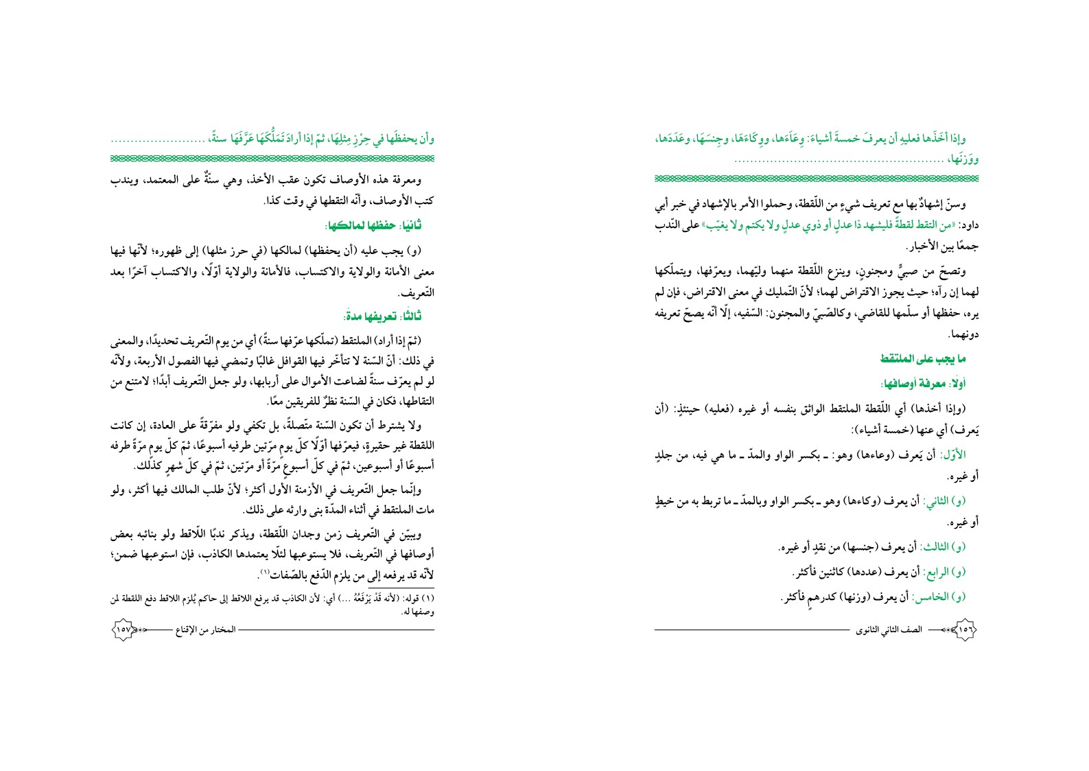 وإذا أخَذَها فعليه أن يعرف خمسة أشياء وِعَاءَها ووِكَاءَهَا وَعِنسَهَا وَعَدَدَها ووزنها وسنّ إشهاد بها مع تعريف شيء من اللقطة وحملوا الأمر بالإشهاد في خبر أبي داود من التقط لقطةً فليشهد ذا عدلٍ أو ذوي عدل ولا يكتم ولا يغيب على الندب جمعا بين الأخبار وتصح من صبي ومجنون وينزع اللقطة منهما وليهما ويعرفها ويتملكها لهما إن رآه حيث يجوز الاقتراض لهما لأنّ التمليك في معنى الاقتراض فإن لم يره حفظها أو سلّمها للقاضي وكالصبي والمجنون السفيه إلا أنه يصح تعريفه دونهما ما يجب على الملتقط أولا معرفة أوصافها وإذا أخذها أي اللقطة الملتقط الواثق بنفسه أو غيره فعليه حينئذ أن يعرف أي عنها خمسة أشياء الأول أن يعرف وعاءها وهو - بكسر الواو والمد ـ ما هي فيه من جلد أو غيره و الثاني أن يعرف وكاءها وهو ـ بكسر الواو وبالمد ـ ما تربط به من خيط أو غيره و الثالث أن يعرف جنسها من نقد أو غيره و الرابع أن يعرف عددها كاثنين فأكثر و الخامس أن يعرف وزنها كدرهم فأ الصف الثاني الثانوى فأكثر وأن يحفظها في حِرْزِ مِثلِهَا ثمّ إذا أرادَ تَمَلُّكَهَا عَرَّفَهَا سنةً ومعرفة هذه الأوصاف تكون عقب الأخذ وهي سنة على المعتمد ويندب كتب الأوصاف وأنه التقطها في وقت كذا ثانيا حفظها لمالكها و يجب عليه أن يحفظها لمالكها في حرز مثلها إلى ظهوره لأنها فيها معنى الأمانة والولاية والاكتساب فالأمانة والولاية أولًا والاكتساب آخرًا بعد التعريف ثالثا تعريفها مدة ثم إذا أراد الملتقط تملكها عرفها سنةً أي من يوم التعريف تحديدا والمعنى في ذلك أن السنة لا تتأخر فيها القوافل غالبًا وتمضي فيها الفصول الأربعة ولأنه لو لم يعرف سنةً لضاعت الأموال على أربابها ولو جعل التعريف أبدًا لامتنع من التقاطها فكان في السنة نظر للفريقين معا شهر ولا يشترط أن تكون السنة متصلة بل تكفي ولو مفرّقةً على العادة إن كانت اللقطة غير حقيرة فيعرفها أوّلًا كلّ يوم مرتين طرفيه أسبوعًا ثمّ كلّ يوم مرّةً طرفه كذلك أسبوعًا أو أسبوعين ثمّ في كل أسبوع مرةً أو مرتين ثمّ في كلّ شـ وإنما جعل التعريف في الأزمنة الأول أكثر لأنّ طلب المالك فيها أكثر ولو مات الملتقط في أثناء المدة بنى وارثه على ذلك ويبين في التعريف زمن وجدان اللقطة ويذكر ندبًا اللاقط ولو بنائبه بعض أوصافها في التعريف فلا يستوعبها لئلا يعتمدها الكاذب فإن استوعبها ضمن لأنه قد يرفعه إلى من يلزم الدفع بالصفات ۱ ۱ قوله لأنه قَدْ يَرْفَعُهُ أي لأن الكاذب قد يرفع اللاقط إلى حاكم يُلزم اللاقط دفع اللقطة لمن المختار من الإقناع وصفها له |