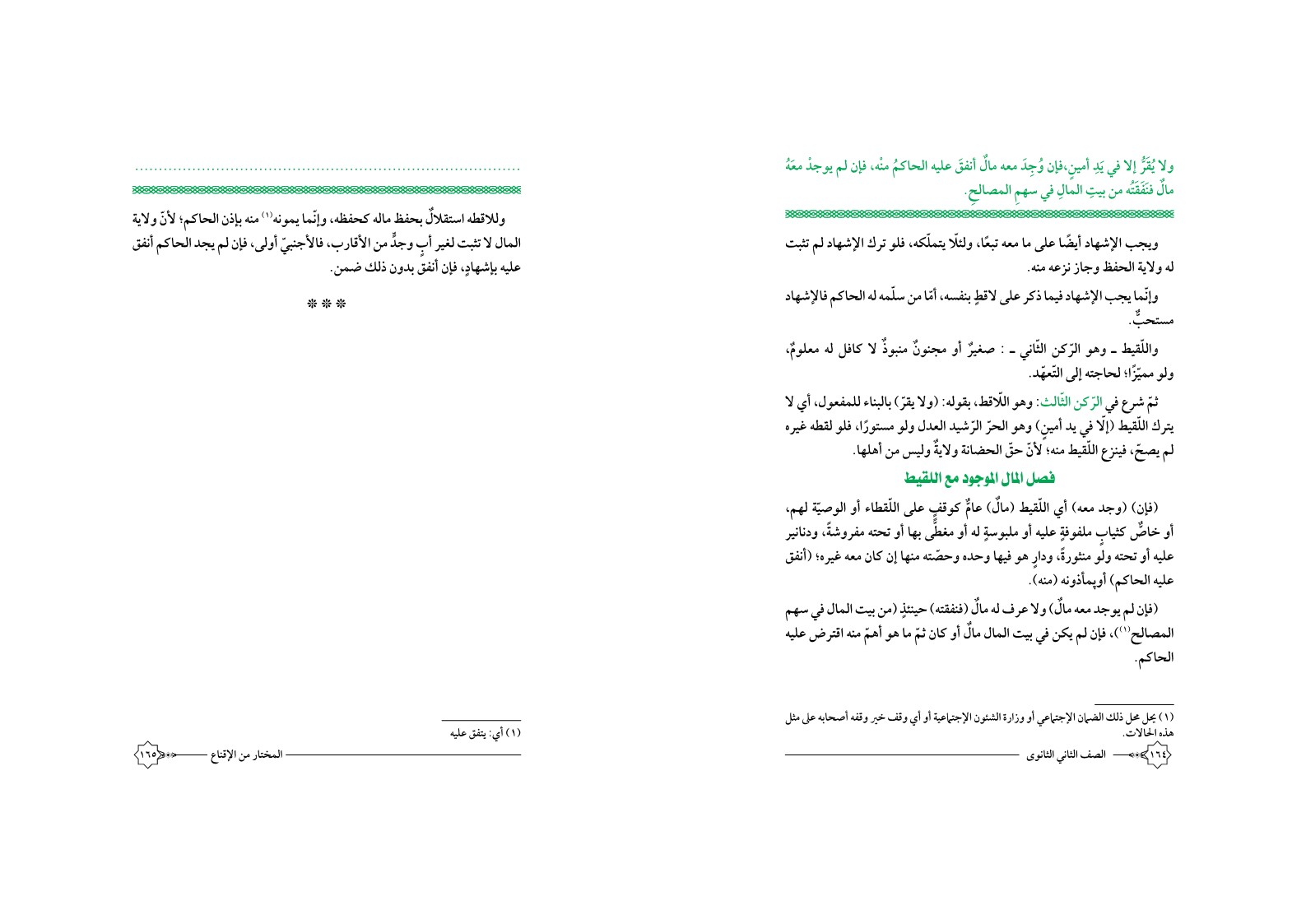 ولا يُقر إلا في يَدِ أمين فإن وُجِدَ معه مالٌ أنفقَ عليه الحاكم منه فإن لم يوجد معه المصالح مال فنَفَقَتُه من بيتِ المالِ في سهم ويجب الإشهاد أيضًا على ما معه تبعًا ولئلا يتملكه فلو ترك الإشهاد لم تثبت له ولاية الحفظ وجاز نزعه منه وإنما يجب الإشهاد فيما ذكر على لاقط بنفسه أما من سلّمه له الحاكم فالإشهاد مستحب واللقيط ـ وهو الركن الثاني - صغير أو مجنون منبوذ لا كافل له معلوم ولو مميزا لحاجته إلى التعهد ثم شرع في الركن الثالث وهو اللاقط بقوله ولا يقرّ بالبناء للمفعول أي لا يترك اللقيط إلا في يد أمين وهو الحرّ الرشيد العدل ولو مستورا فلو لقطه غيره لم يصح فينزع اللقيط منه لأنّ حق الحضانة ولاية وليس من أهلها فصل المال الموجود مع اللقيط فإن وجد معه أي اللقيط مال عام كوقف على اللقطاء أو الوصية لهم أو خاص كثياب ملفوفة عليه أو ملبوسة له أو مغطى بها أو تحته مفروشة ودنانير عليه أو تحته ولو منثورةً ودار هو فيها وحده وحصّته منها إن كان معه غيره أنفق عليه الحاكم أو بمأذونه منه فإن لم يوجد معه مال ولا عرف له مال فنفقته حينئذ من بيت المال في سهم المصالح فإن لم يكن في بيت المال مال أو كان ثمّ ما هو أهم منه اقترض عليه وللاقطه استقلال بحفظ ماله كحفظه وإنّما يمونه ۱ منه بإذن الحاكم لأن ولاية المال لا تثبت لغير أب وجد من الأقارب فالأجنبي أولى فإن لم يجد الحاكم أنفق عليه بإشهاد فإن أنفق بدون ذلك ضمن الحاكم هذه الحالات 1 يحل محل ذلك الضمان الإجتماعي أو وزارة الشئون الإجتماعية أو أي وقف خير وقفه أصحابه على مثل الصف الثاني الثانوى 1 أي يتفق عليه المختار من الإقناع |