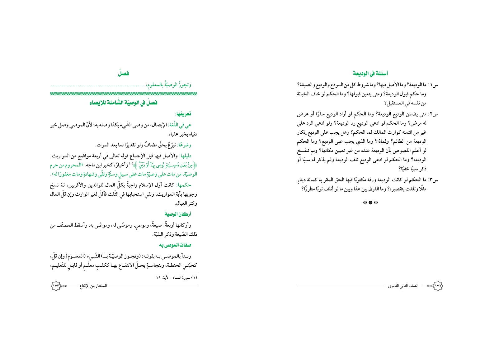 | أسئلة في الوديعة س ١ ما وما الأصل فيها شروط كل من المودع والوديع والصيغة حكم قبول ومتى يتعين قبولها الحكم لو خاف الخيانة نفسه المستقبل ٢ متى يضمن الوديع أراد سفرًا أو عرض له مرض ادعى رد ولو الرد على غير ائتمنه كوارث المالك فما وهل يجب إنكار الظالم ولماذا الذي أعلم اللصوص بأن عنده تعيين مكانها وبم تنفسخ تلف ولم يذكر سببا ذكر سببًا خفيا ۳ كانت ورقة مكتوبًا الحق المقر به كمائة دينار مثلًا وتلفت بتقصيره الفرق بين هذا وبين أتلف ثوبًا مطرزًا فصل وتجوز الوصية بالمعلوم تعريفها الشاملة للإيصاء باللغة الإيصال وصى الشيء بكذا وصله لأنّ الموصي وصل خير هي ا دنياه بخیر عقباه وشرعًا تبرع بحق مضاف تقديرًا لما بعد الموت دليلها والأصل قبل الإجماع قوله تعالى أربعة مواضع المواريث مِنْ بَعْدِ وَصِيَّةٍ يُوصِي بِهَا أَوْ دَين ۱ وأخبار كخبر ابن ماجه المحروم حرم الوصيّة مات وصيّةٍ سبيل وسنةٍ وتقى وشهادة ومات مغفورا حكمها أوّل الإسلام واجبةً بكل المال للوالدين والأقربين ثم نسخ وجوبها بآية وبقي استحبابها الثلث فأقل لغير الوارث وإن قل الصف الثاني الثانوى وكثر العيال أركان وأركانها صيغة وموص وموصى وأسقط المصنف ذلك الصيغة وذكر البقية صفات الموصى وبدأ بالموصى بقوله بـ المعلــوم كحبتي الحنطة وبنجاسة يحل الانتفاع بها ككلب معلم قابل للتعليم 1 سورة النساء الآية ١١ المختار الإقناع |