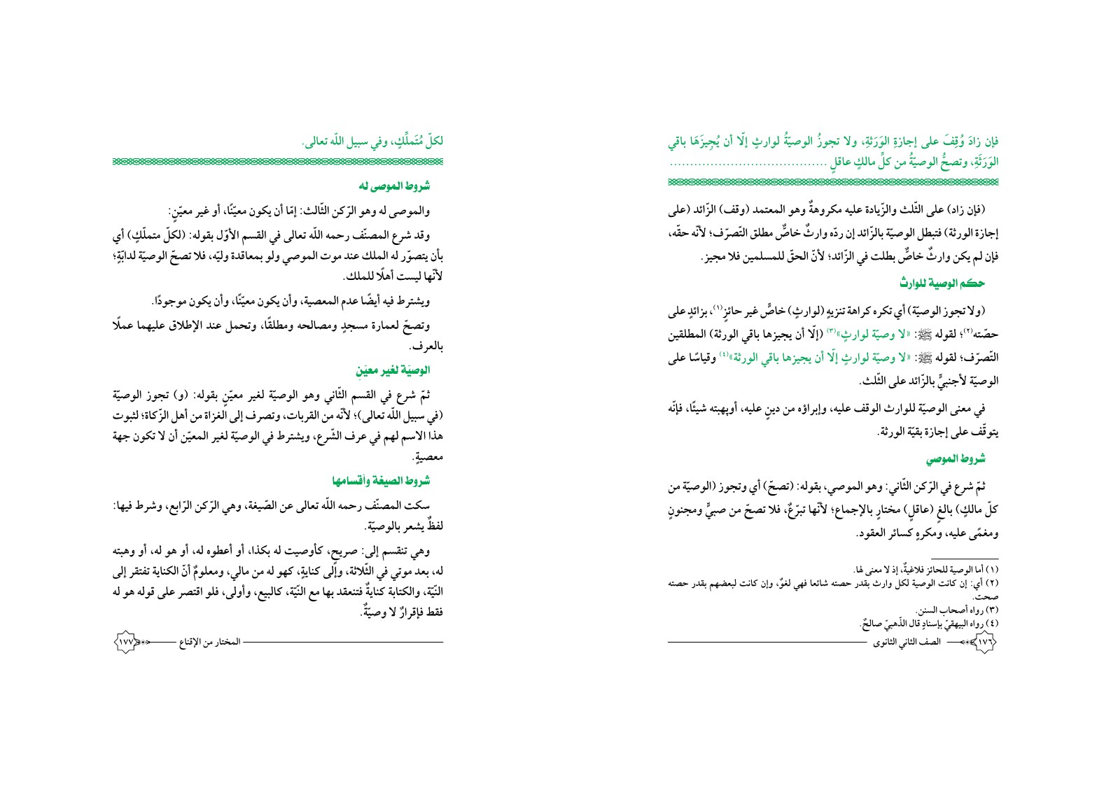 | فإن زادَ وُقِفَ على إجازةِ الوَرَثَةِ ولا تجوز الوصيَّةُ لوارث إِلَّا أَن يُجِيزَهَا باقي وتصح الوصية من كلَّ مالك عاقل لكلّ مُتَملَّك وفي سبيل الله تعالى زاد الثلث والزيادة عليه مكروهةً وهو المعتمد وقف الزائد إجازة الورثة فتبطل الوصيّة بالزائد إن ردّه وارث خاص مطلق التصرف لأنه حقه لم يكن بطلت في لأن الحق للمسلمين فلا مجيز حكم للوارث أي تكره كراهة تنزيه الوارث غیر حائز ۱ بزائد حصته لقوله صلى وسلم لا وصية ۳ إلا أن يجيزها المطلقين وقياسًا لأجنبي معنى الوقف وإبراؤه دين أو يهبته شيئًا فإنّه يتوقف بقية شروط الموصي ثم شرع الركن الثاني بقوله تصح وتجوز كل بالغ مختار بالإجماع لأنها تبرع صبي ومجنون ومغمى ومكره كسائر العقود 1 أما للحائز فلاغية إذ لها كانت لكل بقدر شائعا فهي لغو وإن لبعضهم صحت رواه أصحاب السنن ٤ البيهقي بإسناد قال الذهبي صالح الصف الثانوى الموصى له والموصى الثالث إما يكون معينًا غير معيّن وقد ا المصنف رحمه القسم الأوّل متملك بأن يتصوّر الملك عند موت ولو بمعاقدة وليه لدابة ليست أهلًا للملك ويشترط فيه أيضًا عدم المعصية وأن معينا موجودًا لعمارة مسجد ومصالحه ومطلقا وتحمل الإطلاق عليهما عملًا بالعرف لغير معين و القربات وتصرف إلى الغزاة أهل الزكاة لثبوت هذا الاسم لهم عرف الشرع المعين تكون جهة معصية الصيغة وأقسامها سكت عن وهي الرابع وشرط فيها لفظ يشعر بالوصية تنقسم صريح كأوصيت بكذا أعطوه هو وهبته بعد موتي الثلاثة وإلى كناية كهو مالي ومعلوم الكناية تفتقر النية والكتابة فتنعقد بها مع كالبيع وأولى فلو اقتصر قوله فقط فإقرار المختار الإقناع |