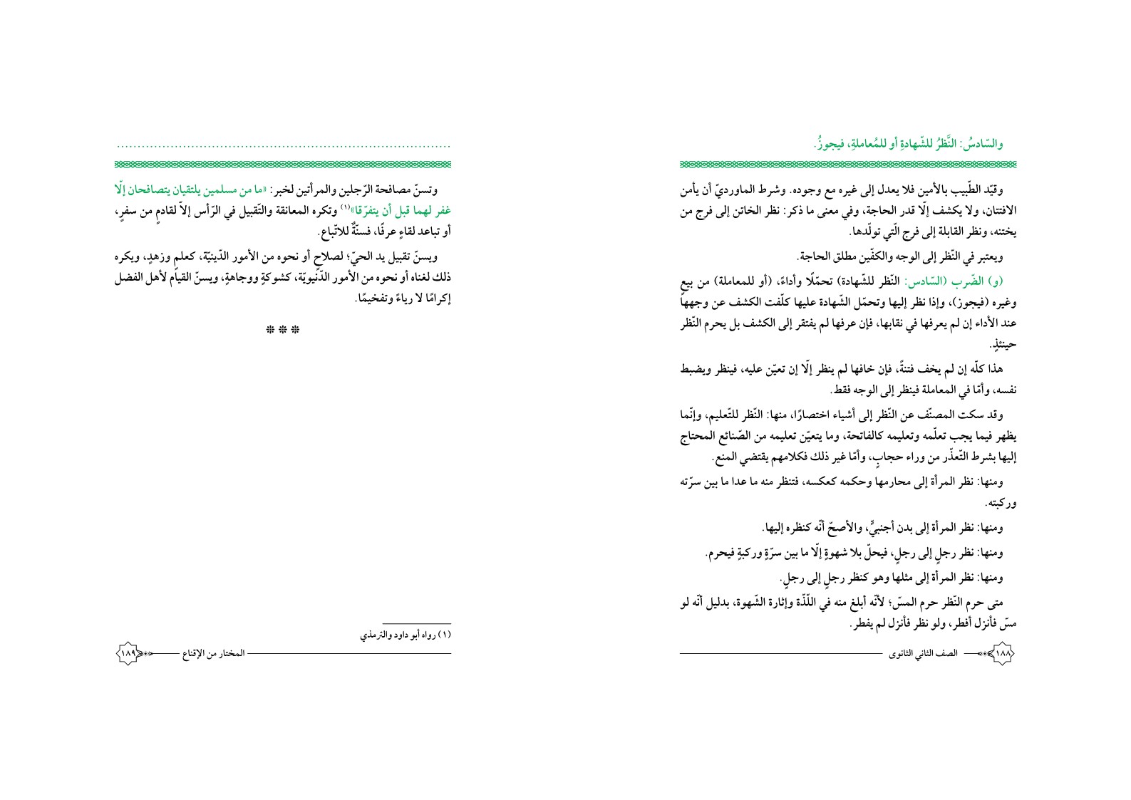 | والسادس النَّظرُ للشَّهادة أو للمعاملة فيجوز وقيد الطبيب بالأمين فلا يعدل إلى غيره مع وجوده وشرط الماوردي أن يأمن الافتتان ولا يكشف إلا قدر الحاجة وفي معنى ما ذكر نظر الخاتن فرج من يختنه ونظر القابلة التي تولّدها ويعتبر في النظر الوجه والكفين مطلق و الضرب السادس للشهادة تحملًا وأداء بيع وغيره وإذا إليها وتحمّل الشّهادة عليها كلفت الكشف عن وجهها عند الأداء إن لم يعرفها نقابها فإن عرفها يفتقر بل يحرم حينئذ هذا كله يخف فتنةً خافها ينظر إلّا تعين عليه فينظر ويضبط نفسه وأما المعاملة فقط وقد سكت المصنف أشياء اختصارًا منها للتعليم وإنما يظهر فيما يجب تعلّمه وتعليمه كالفاتحة وما يتعيّن تعليمه الصنائع المحتاج بشرط التعذر وراء حجاب غير ذلك فكلامهم يقتضي المنع ومنها المرأة محارمها وحكمه کعکسه فتنظر منه عدا بين سرته وركبته بدن أجنبي والأصح أنه كنظره رجل فيحلّ بلا شهوة سرّة وركبة فيحرم مثلها وهو كنظر متى حرم المس لأنه أبلغ اللذة وإثارة الشهوة بدليل لو مس فأنزل أفطر ولو يفطر الصف الثاني الثانوي وتسن مصافحة الرّجلين والمرأتين لخبر مسلمين يلتقيان يتصافحان غفر لهما قبل يتفرقا ۱ وتكره المعانقة والتقبيل الرأس لقادم سفر تباعد لقاء عرفًا فسنةٌ للاتباع ويسن تقبيل يد الحيّ لصلاح نحوه الأمور الدينية كعلم وزهد ويكره لغناه الدنيوية كشوكة ووجاهة ويسنّ القيام لأهل الفضل إكراما لا رياء وتفخيما رواه أبو داود والترمذي المختار الإقناع |