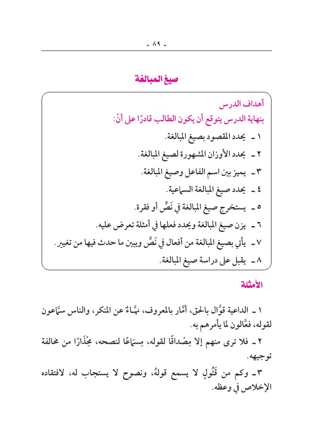 أهداف الدرس صيغ المبالغة بنهاية الدرس يتوقع أن يكون الطالب قادرًا على أن يحدد المقصود بصيغ المبالغة - يحدد الأوزان المشهورة لصيغ المبالغة - يميز بين اسم الفاعل وصيغ المبالغة - يحدد صيغ المبالغة السماعية ه - يستخرج صيغ المبالغة في نَص أو فقرة ٦ - يزن صيغ المبالغة ويحدد فعلها في أمثلة تعرض عليه - يأتي بصيغ المبالغة من أفعال في نَصَّ ويبين ما حدث فيها من تغيير يقبل على دراسة صيغ المبالغة الأمثلة ١ - الداعية قوال بالحق أمَّار بالمعروف نهاءُ عن المنكر والناس سماعون لقوله فعالون لما يأمرهم به ٢ - فلا ترى منهم إلا مِصْداقًا لقوله مسماعًا لنصحه مُحِذَارًا من مخالفة توجيهه ٣- وكم من قبول لا قوله يسمع ونصوح لا يستجاب له لافتقاده الإخلاص في وعظه |