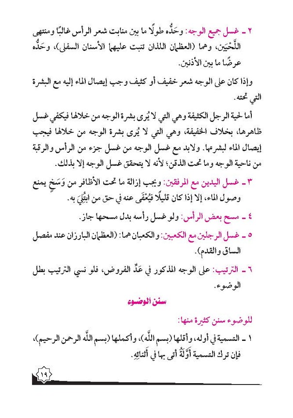 | التي ومنتهى - غسل جميع الوجه وحده طولا ما بين من ع طولاً منابت شعر الرأس غالبًا و اللَّحْيَين وهما العظمان اللذان تنبت عليهما الأسنان السفلى عرضًا الأذنين وإذا كان على خفيف أو كثيف وجب إيصال الماء إليه مع البشرة لمحته أما لحية الرجل الكثيفة وهي ا لا يرى بشرة خلالها فيكفي ظاهرها بخلاف الخفيفة يُرى فيجب لبشرتها ولابد جزء والرقبة ناحية وما تحت الذقن لأنه يتحقق إلا بذلك اليدين المرفقين ويجب إزالة الأظافر وَسَخِ يمنع وصول إذا قليلًا فيُعفى عنه في حق ابتلي به ٤ مسح بعض ولو رأسه بدل مسحها جاز ه الرجلين الكعبين والكعبان هما البارزان عند مفصل الساق والقدم ٦ الترتيب المذكور عَد الفروض فلو نسي بطل الوضوء للوضوء سنن كثيرة منها ۱ التسمية أوله وأقلها بسم الله وأكملها الرحمن الرحيم فإن ترك أولةً أتى بها أثنائِهِ |