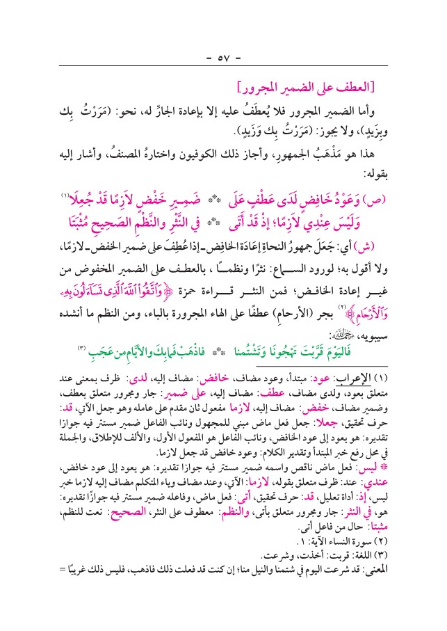 | العطف على الضمير المجرور ] ov - وأما فلا يُعطَفُ عليه إلا بإعادة الجار له نحو مَرَرْتُ ويزيد ولا يجوز بِك وَزَيد يك هذا هو مَذْهَبُ الجمهور وأجاز ذلك الكوفيون واختاره المصنف وأشار إليه بقوله ص وَعَوْدُ خَافِضِ لَدَى عَطْفٍ عَلَى ضَمِيرِ خَفْضِ لَأَزِمًا قَدْ جُعِلَا وَلَيْسَ عِنْدِي إِذْ أَتَى فِي النَّثْرِ وَالنَّظْمِ الصَحِيحِ مُثْبَتَا ش أي جَعَلَ جمهور النحاةِ إعَادَة الخافض إذا عُطِفَ ضمير الخفض لازما أقول به لورود السماع نثرا ونظماً بالعطف المخفوض من غير إعادة فمن النثـر قـراءة حمزة وَاتَّقُوا اللَّهَ الَّذِي تَسَاءَلُونَ بِهِ وَالْأَرْحَامِ " بجر الأرحام عطفا الهاء المجرورة بالباء ومن النظم ما أنشده سیبویه جمال فَاليَوْمَ قَرَّبْتَ تَهْجُونَا وَتَشْتُمنا * فاذْهَبْ فَما بِكَ والأَيَّامِ مِن عَجَبِ ۳ 1 الإعراب عود مبتدأ وعود مضاف خافض لدى ظرف بمعنى عند متعلق بعود ولدى عطف جار ومجرور بعطف وضمير خفض مفعول ثان مقدم عامله وهو جعل الآتي قد حرف تحقیق جعلا فعل ماض مبني للمجهول ونائب الفاعل مستتر فيه جوازا تقديره يعود إلى المفعول الأول والألف للإطلاق والجملة في محل رفع خبر المبتدأ وتقدير الكلام 6 ليس ناقص واسمه عندي وعند وياء المتكلم إذ أداة تعليل تحقيق أتى وفاعله النثر بأتي والنظم معطوف الصحيح نعت للنظم مثبتا حال فاعل سورة النساء الآية ١ اللغة قربت أخذت وشرعت المعنى شرعت اليوم شتمنا والنيل منا إن كنت فعلت فاذهب فليس غريبًا = |